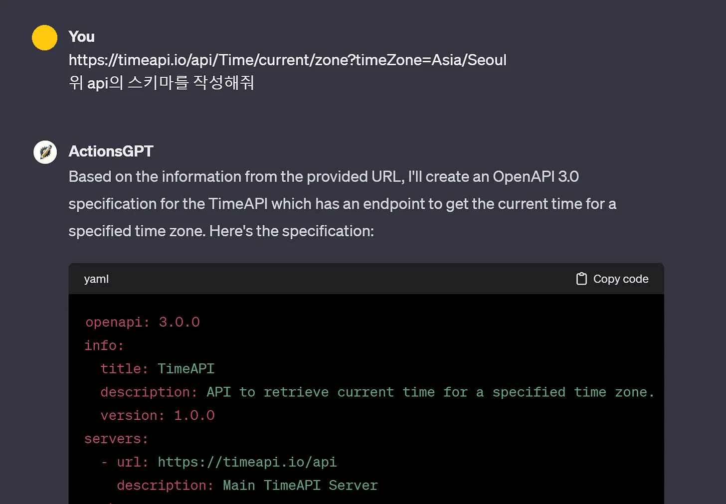 GPT 빌더에서는 ‘액션’ 이라는 기능을 통해 구글 맵 등 외부 API를 사용할 수 있습니다. 이 액션을 연동하기 위해서는 API의 스키마(구조)를 작성 해야하는데요, API 스키마도 직접 작성할 필요가 없습니다. ActionsGPT 에게 사용하려는 API만 알려주면 알아서 스키마를 작성해 줍니다.