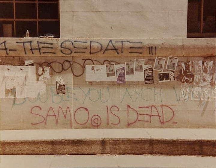 바스키아는 알 디아즈(Al Diaz)를 만나 SAMO(SAMe Old shit의 약자)를 만듭니다. 그리고 그들은 함께 뉴욕의 거리에 ‘SAMO©’라는 낙서를 하고 다녔습니다. 하지만 그들은 서로 다른 곳을 바라보고 있다는 것을 깨달았습니다. 알 디아즈는 ‘그림’에 집중하는 성격이었고, 바스키아는 그림을 그리는 ‘사람’에 좀 더 집중하는 성격이었죠. 알 디아즈는 익명의 거리 작가로 남고 싶어 했지만 바스키아는 자신을 더 드러내고 싶고, 유명해지고 싶어 했습니다. 그렇게 SAMO는 ‘SAMO IS DEAD’라는 낙서를 끝으로 해체되었습니다.