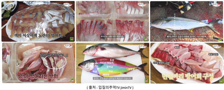 방어에 대한 정보를 찾아볼 때, 식탁에 올라가는 415종의 제철 수산물에 대한 실전 정보가 담긴 <생선 바이블>도 출판하신, 어류칼럼니스트 김지민님의 '방어회 먹기 전 영상'이나, 이원일 셰프님의 '부위별 맛 표현 영상' 하나만 보면 끝납니다. 비전문가인, 일반인 분들의 (정보성) 방어 영상을 볼 이유가 없습니다. 입질의추억님 영상에선 실전 꿀팁이 담겨있고, 이원일 셰프님 영상엔 부위별 특징과 맛이 아주 세세히 담겨있기 때문이죠. 이건 그분들밖에 못하는 콘텐츠이기도 합니다.