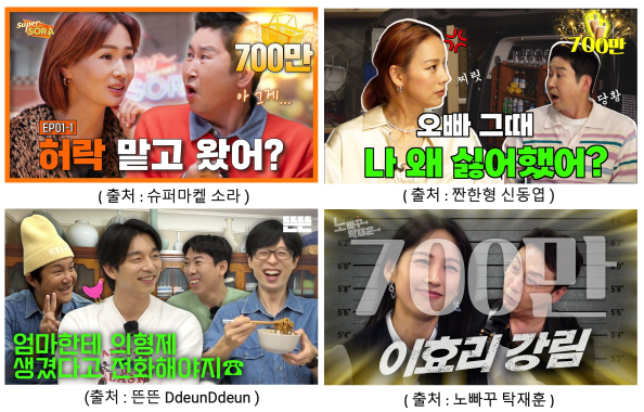 그렇다면 왜 '재미'와 '정보'를 체크하는 게 중요할까요? 12월 2주차엔이소라님과 신동엽님의 영상에서, '대국민적 인지도를 갖춘 연예인 + 콘텐츠 전문 제작 집단'이 등장하면, 이쪽으로 트래픽이 다 쏠릴 수 밖에 없다고 말씀드렸습니다. 이러한 영상들은 대부분 '재미' 측면이고, '재미'라는 관점에서 매우 고퀄리티 콘텐츠입니다. 짠한형 신동엽 채널이나 뜬뜬 - 핑계고, 노빠꾸 탁재훈 채널이 대표적이죠. 유튜브의 기반인 '취향', 즉 카테고리에 크게 구애받지 않고, 예능을 즐긴다는 느낌으로, 시청자 파이가 쏠리는 겁니다. (아래 영상은 모두 700만 조회수가 넘었습니다.)
