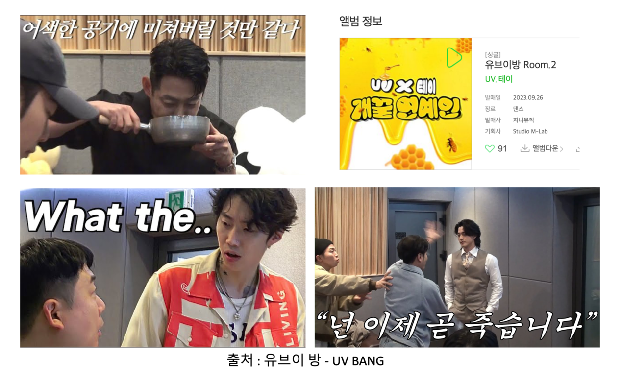 유브이(UV) 채널도 같은 사례인데요. '유브이 녹음실'이라는 콘텐츠입니다. 페이크 다큐로, 유세윤님과 뮤지님이 게스트에 맞게 연기하십니다. '녹음실'이라는 장소에 맞게, 항상 노래를 녹음하고 끝이 나고요. 게스트 분들이 부르신 노래를 발매하기도 합니다. 테이님이 부르신 <개꿀 연예인>이 대표적이죠.