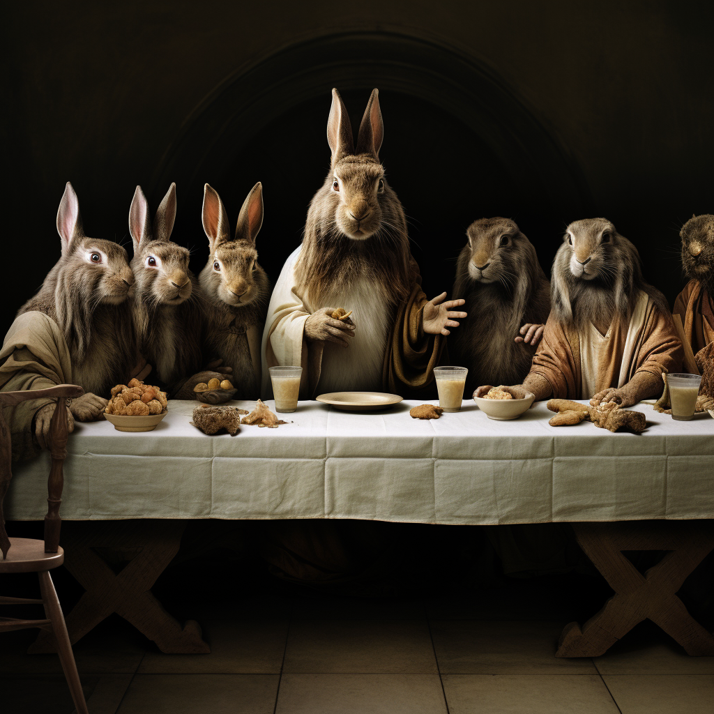 미드저니 프롬프트: The Last Supper by Leonardo da Vinci, Each apostle is transformed into a hare, their expressions and postures meticulously maintained. (레오나르도 다 빈치의 최후의 만찬, 각 사도가 토끼로 변신하여 표정과 자세를 세심하게 유지하고 있습니다.)