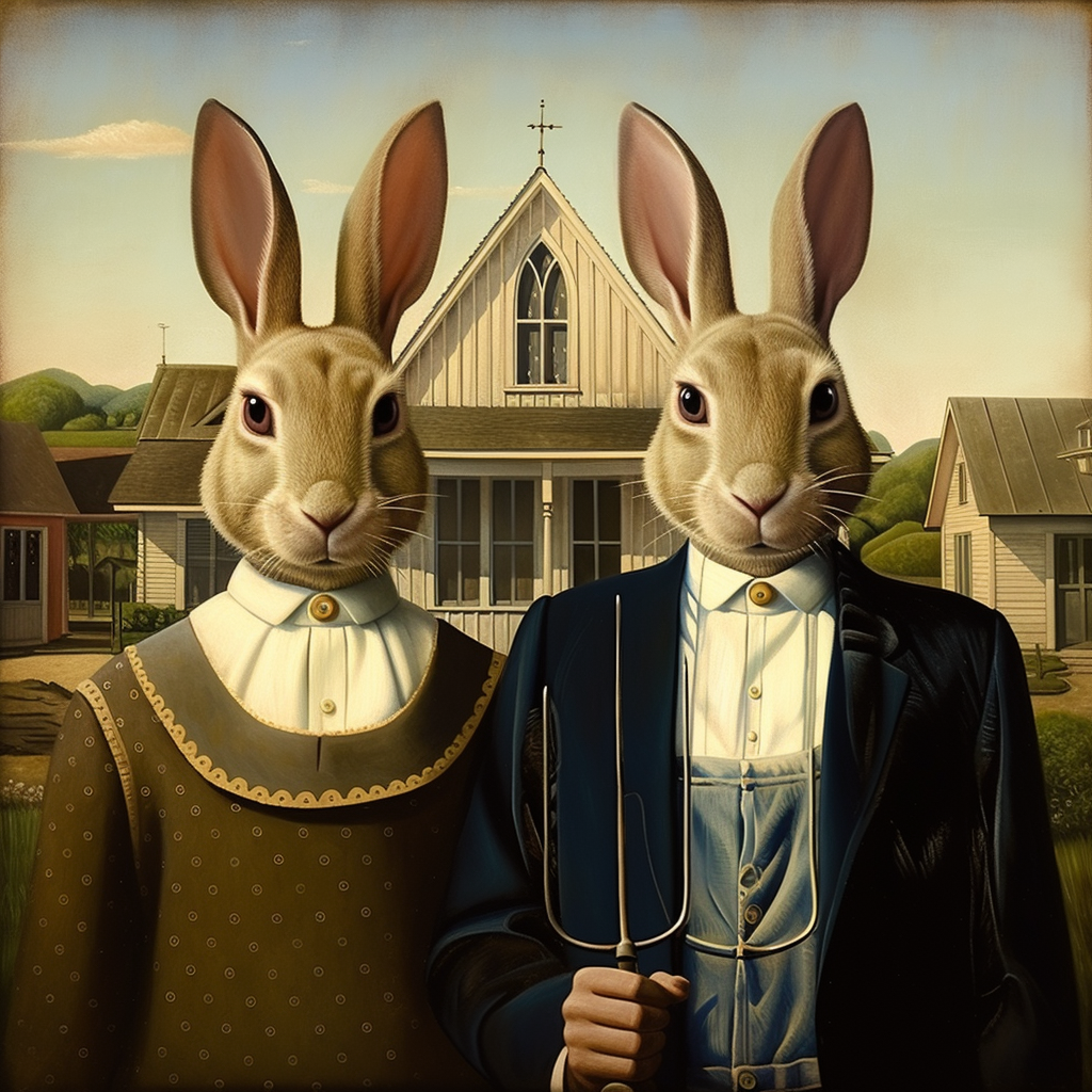 미드저니 프롬프트: American Gothic by Grant Wood, Their faces are replaced with that of serious, yet endearing rabbits, retaining the painting's original stoic atmosphere. (그랜트 우드의 '아메리칸 고딕', 진지하면서도 사랑스러운 토끼의 얼굴로 대체되어 그림 본연의 스토익한 분위기를 유지합니다.)