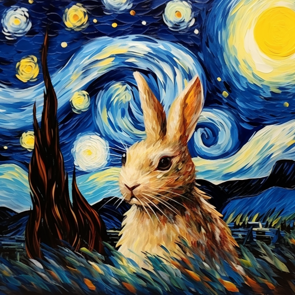 미드저니 프롬프트: The Starry Night by Vincent van Gogh with rabbits (토끼가 있는 빈센트 반 고흐의 '별이 빛나는 밤')