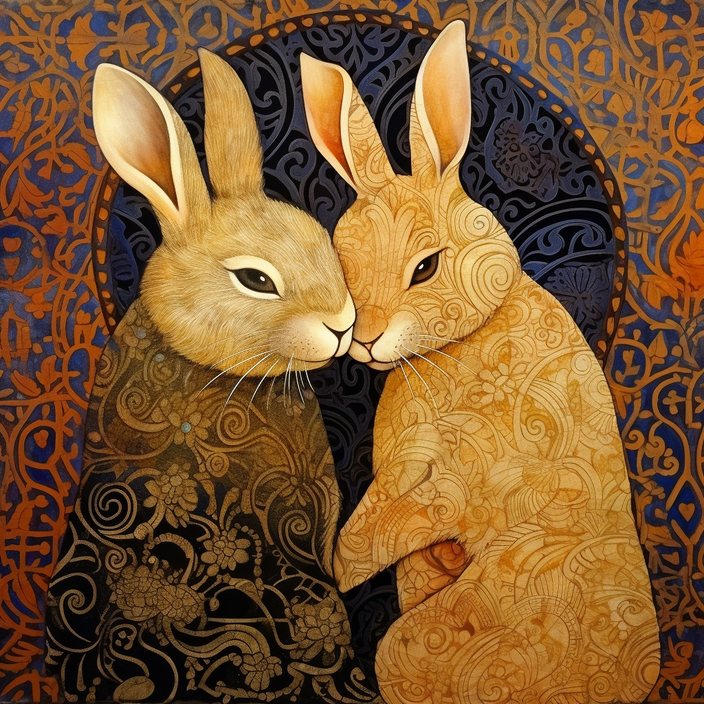 미드저니 프롬프트: The Kiss by Gustav Klimt, Two rabbits are encased in the same golden swirls, their noses tenderly touching. (구스타프 클림트의 '키스', 두 마리의 토끼가 같은 황금빛 소용돌이 속에 둘러싸여 코를 부드럽게 맞대고 있습니다.)