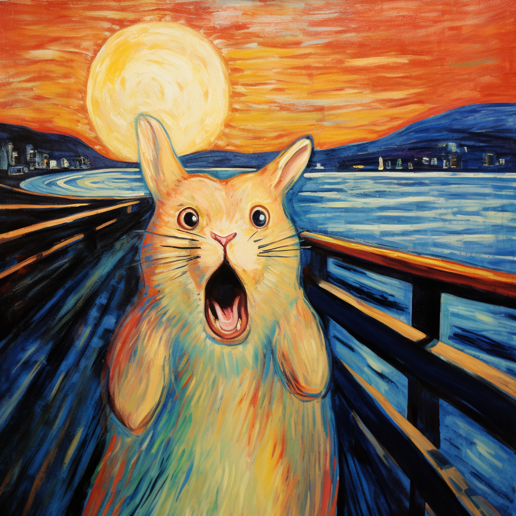 미드저니 프롬프트: The Scream by Edvard Munch, a rabbit holds its paws to its face, its ears back in alarm. (에드바르 뭉크의 '절규'. 토끼가 두 발을 얼굴에 대고 귀를 뒤로 젖힌 채 놀란 표정을 짓고 있습니다.)