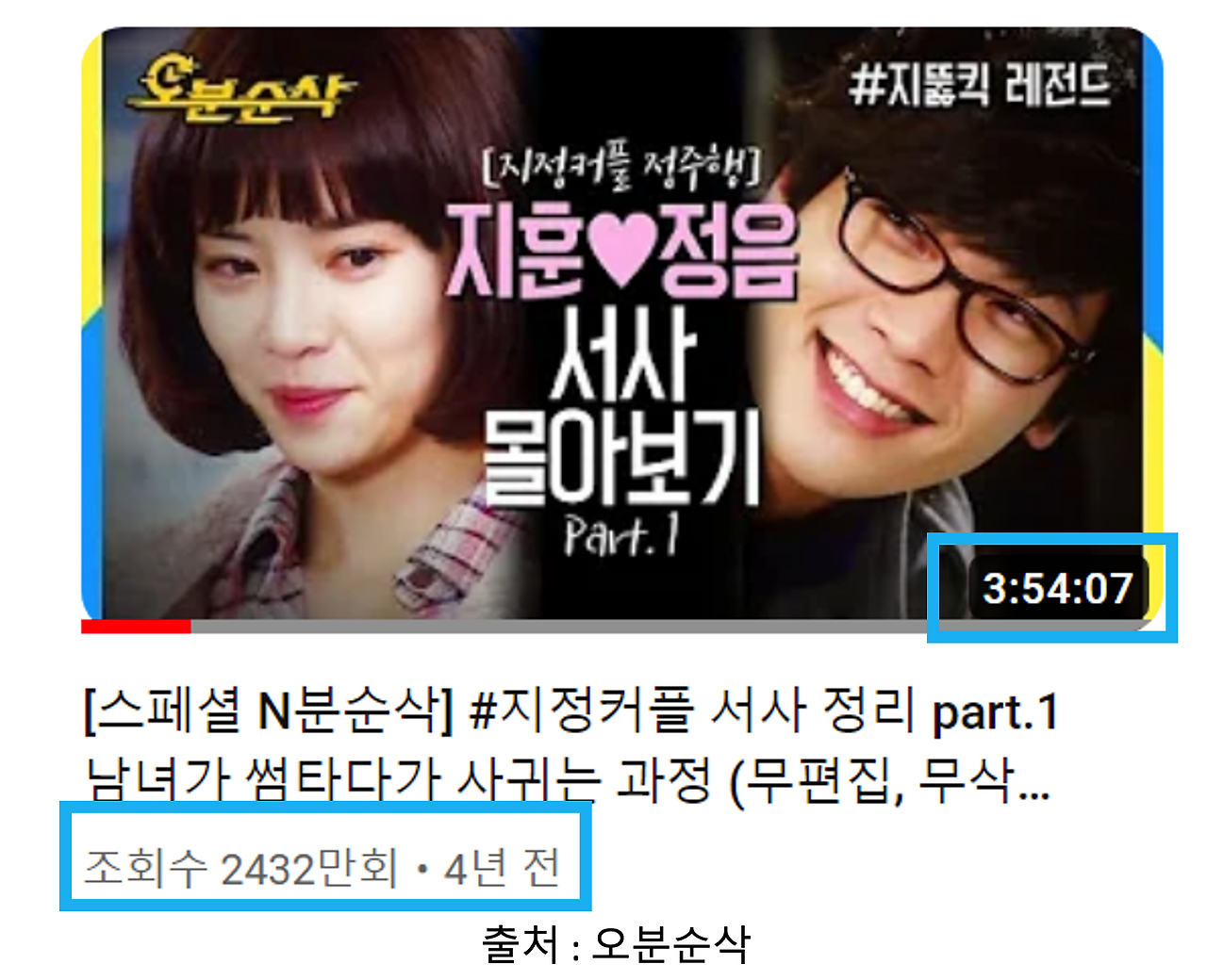 처음 모티브를 얻은 건, MBC의 매쉬업 채널인 오분순삭입니다. <하이킥>의 지훈-정흠 서사를 풀로 올려놓은 3시간 54분짜리 영상이죠. 조회수가 2,400만이 넘습니다. 조회수 수익도 어마어마하겠죠.