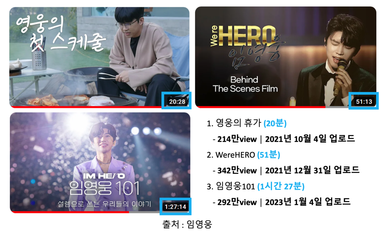제작 및 채널 관리를 해드리는 임영웅님 채널에서 2021년 9월에 20분짜리 영상을 올렸습니다. 200만 뷰 넘게 나왔습니다. 그 뒤 2021년 12월 31일에 50분짜리 영상을 올렸습니다. 이 영상은 KBS2 송년특집으로 단독쇼를 비하인드를 다큐로 찍은 영상입니다. 인급동 1위를 찍고, 1주일 정도 인급동에 머물렀습니다. 그다음 2023년 1월에 1시간 27분짜리 영상을 올렸습니다. 2022년 임영웅님 전국투어 콘서트의 다큐 영상입니다.