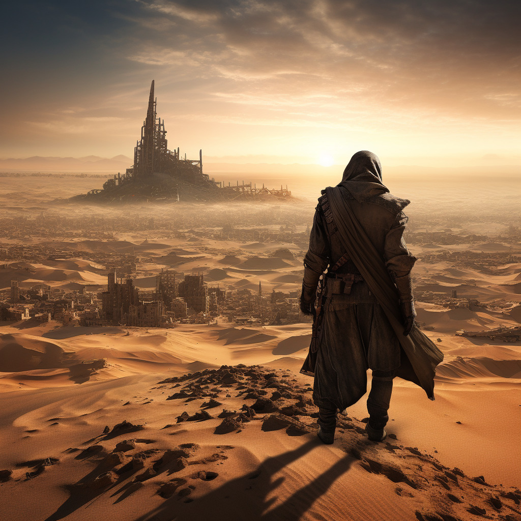 “즉석에서 제작한 갑옷과 무기를 착용하고 문명의 폐허가 눈앞에 있는 종말 이후의 광대한 사막의 모래 언덕을 항해하는 단련된 생존자를 상상해 보세요.”