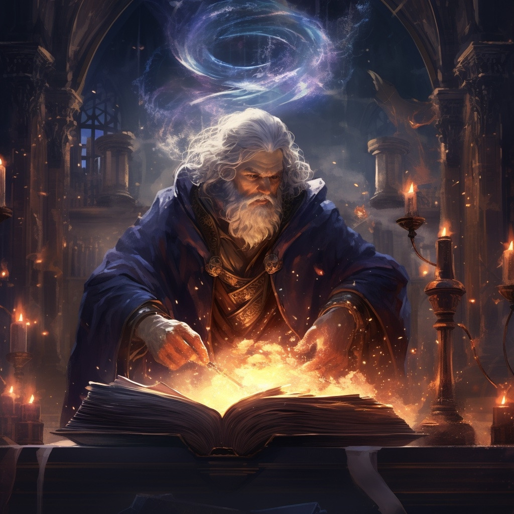 "빛나는 로브를 입고 꼭대기에 크리스탈이 달린 지팡이를 들고 신비한 지식으로 가득 찬 촛불이 켜진 웅장한 도서관에서 고대 고서를 읽고 있는 고대 마법사를 불러내세요."