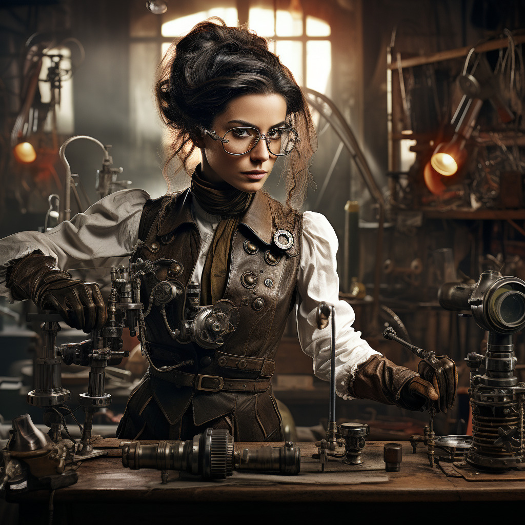 “빅토리아 시대 기술로 가득 찬 작업장에서 황동 장치와 소용돌이치는 증기에 둘러싸여 고글과 가죽 앞치마를 입고 최신 기계 창작물을 들고 있는 스팀펑크 발명가를 상상해 보세요.”