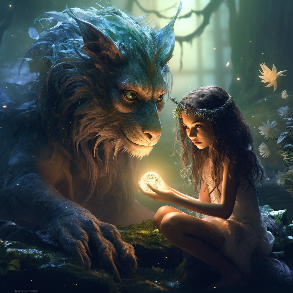 “환상적인 동물과 식물로 가득한 마법에 걸린 숲에서 신화 속 짐승들과 소통할 수 있는 능력을 갖춘 신비한 생물이 속삭이는 모습을 상상해 보세요.”