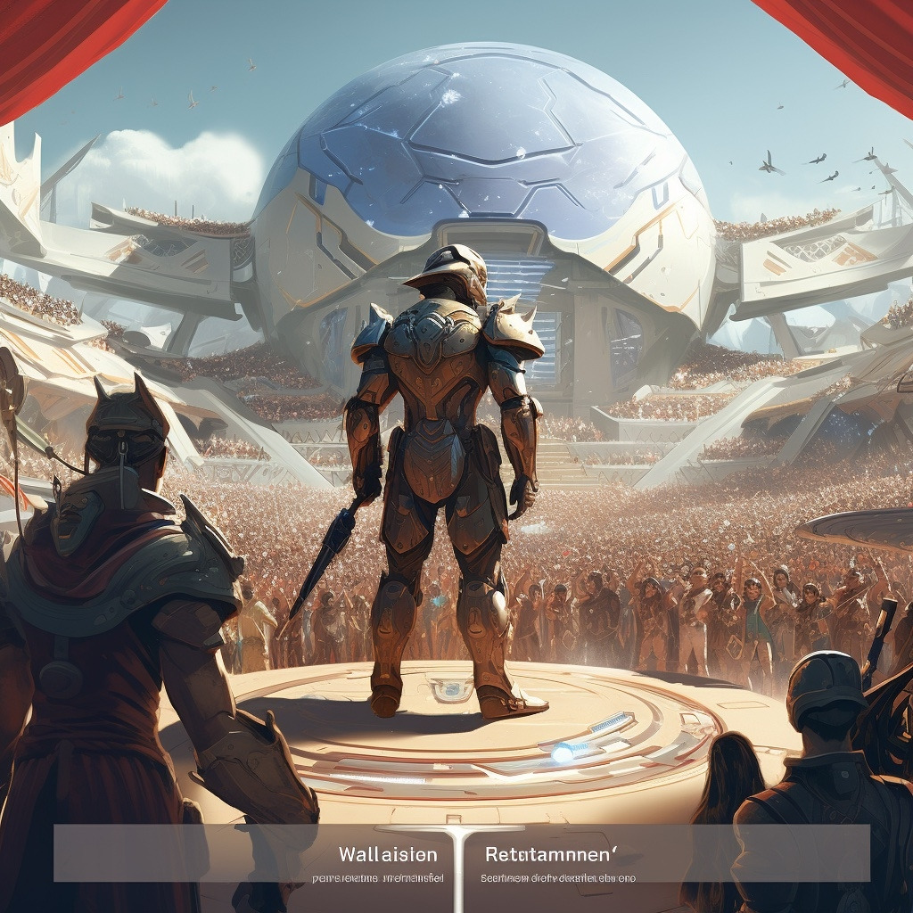 “에너지 기반 무기와 방패를 갖춘 미래형 검투사를 디자인하고 다양한 외계 군중의 환호를 받으며 승리를 거두는 장면을 만드세요.”