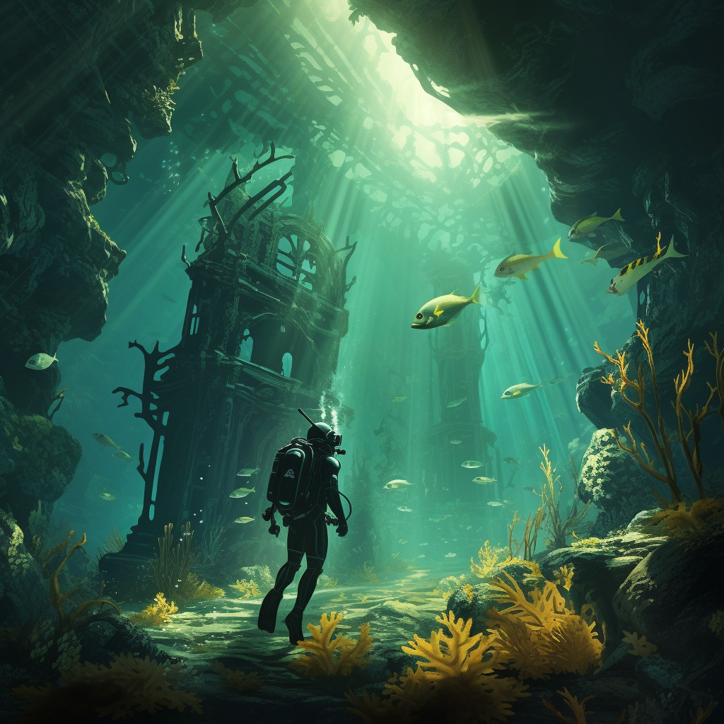 “고급 다이빙 장비를 착용하고 신비한 바다 생물이 숨어 있는 바다 밑에 잠긴 고대 도시의 비밀을 발견하는 수중 탐험가를 상상해 보세요.”