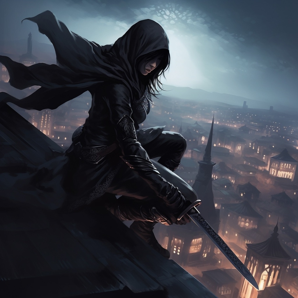 "날렵하고 치명적인 칼날을 준비하고 의심하지 않는 목표에 눈을 고정한 채, 넓게 펼쳐진 도시의 달빛이 비치는 옥상에 서있는 어둠의 암살자를 만듭니다."