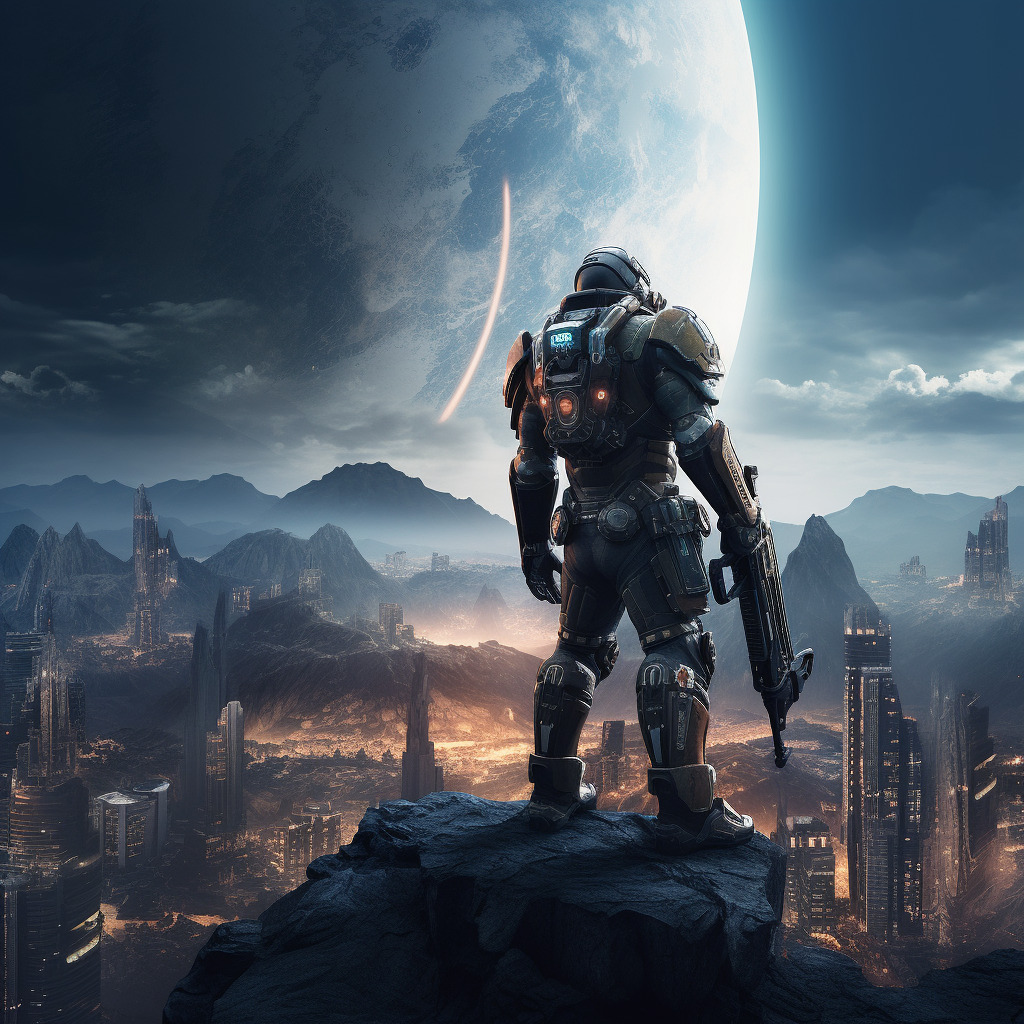 “미래 지향적인 전투복을 입고 초자연적인 도시의 스카이라인이 보이는 머나먼 외계 행성의 거친 지형을 탐험하는 우주 해병을 시각화하세요.”
