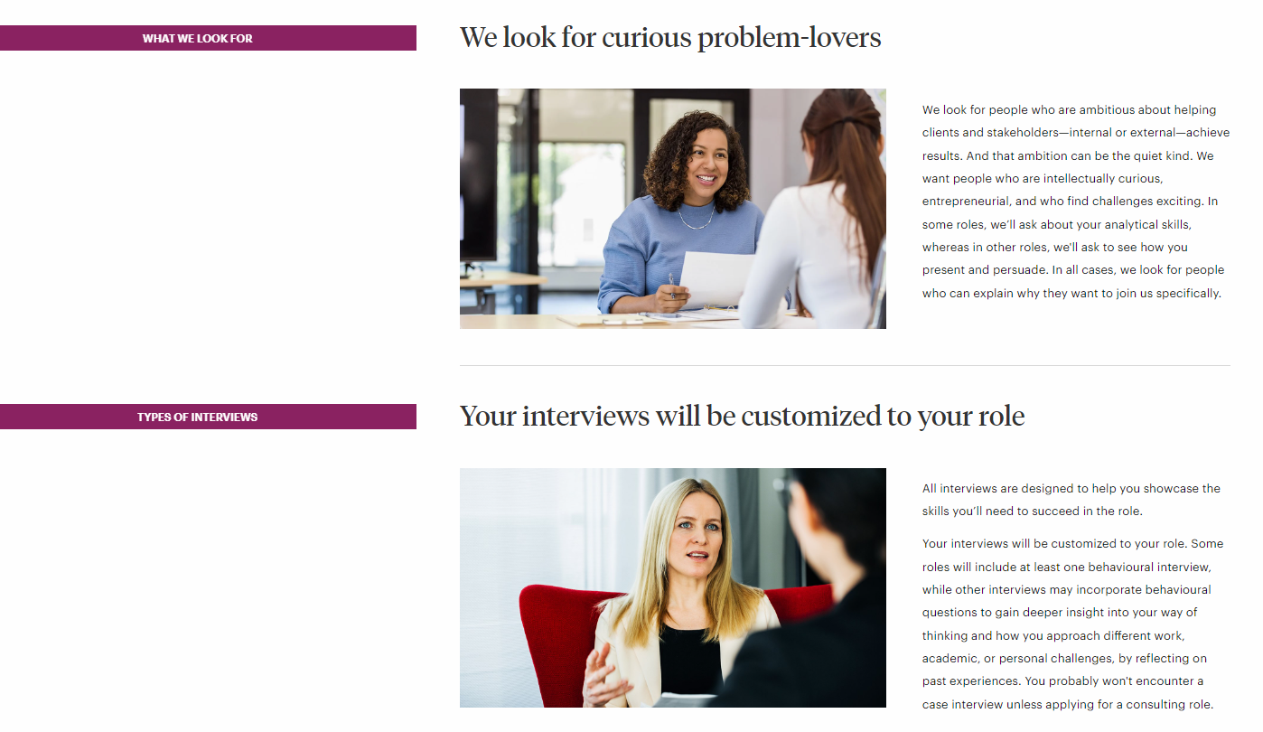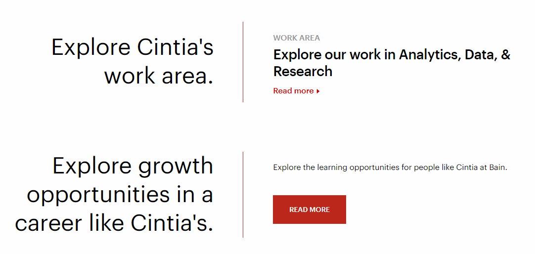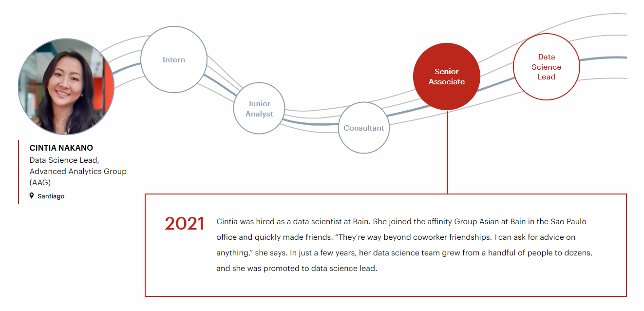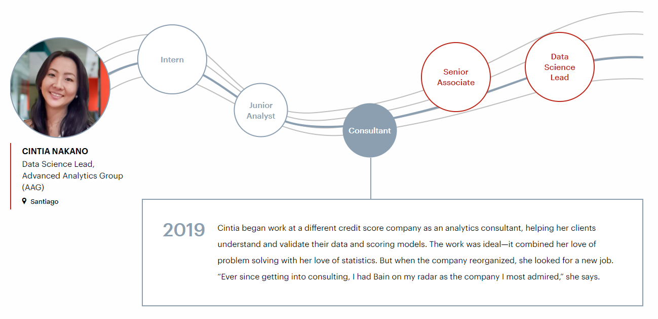 베인 사의 채용페이지에는 커리어 스토리라는 특별한 페이지가 있습니다. 현재 직원들의 이력을 시각화하여, 베인 사에서 그릴 수 있는 구체적인 커리어를 보여주는 페이지입니다. 베인 사에 있는 모든 팀과 직무에 대해 현직자의 직무와 근무지점, 그동안의 경력을 상세하게 보여주고 있습니다. 각 현직자들이 어떤 시작과 과정을 거쳐 베인사로 들어오게 되었는지, 또 베인 사에서 그들이 어떻게 성장했는지 각주를 달아 이해하기 편하게 구성했습니다.