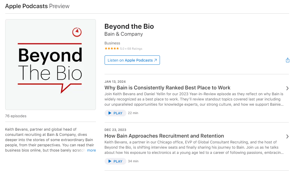베인 사의 컨설턴트 파트너이자 글로벌 책임자인 키스 베반스가 진행하는 팟캐스트입니다. 이 팟캐스트에서는 기업의 비즈니스 활동에 대해 말하기 보다, 그 일을 하고 있는 직원들에 대한 콘텐츠입니다. 리더십, 베인 사의 채용방식, 사내 기업가에서 혁신 전문가가 된 직원의 이야기 등 다양한 내부 직원들의 이야기로 후보자들에게 생동감있는 회사 안 이야기를 전달합니다.