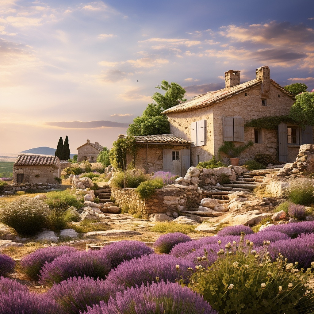 프롬프트: 전통적인 석조 가옥, 테라코타 지붕, 생동감 넘치는 라벤더 밭이 있는 프로방스의 고풍스러운 마을을 묘사하는 장면을 만듭니다.