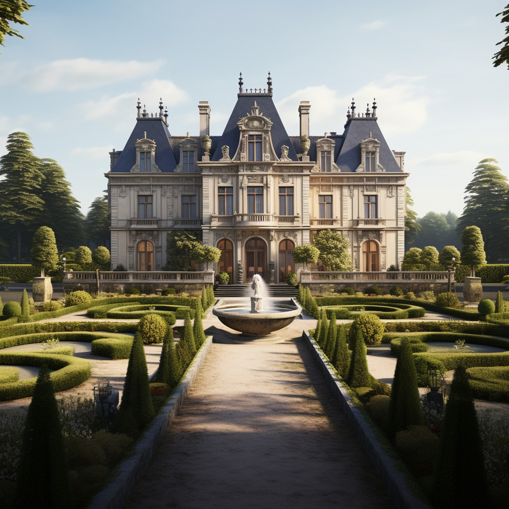 프롬프트: 대칭 디자인, 화려한 장식 및 주변 정식 정원에 중점을 두고 프랑스 시골에 자리잡은 르네상스 성을 디자인하세요.