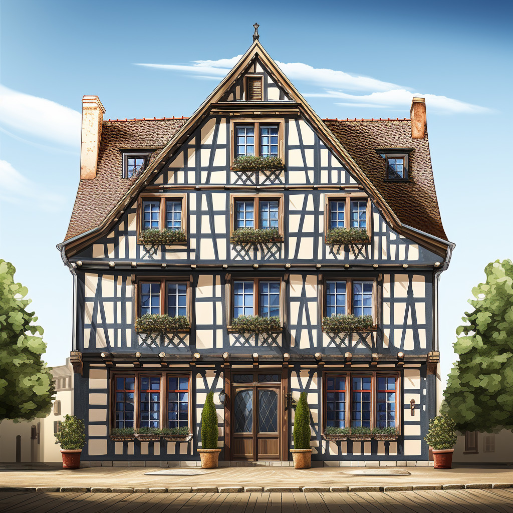 프롬프트: 노르망디의 전통적인 목조 주택 이미지를 생성하여 목재 프레임, 다채로운 외관, 건축물의 역사적 매력을 보여줍니다.
