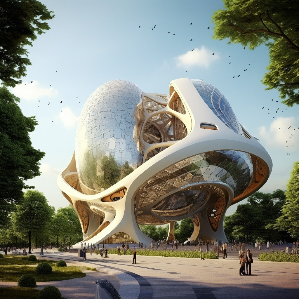 프롬프트: 지속 가능한 기술, 역동적인 형태, 자연과 건축의 환상적인 통합을 통합한 프랑스의 미래형 건물을 설계합니다.