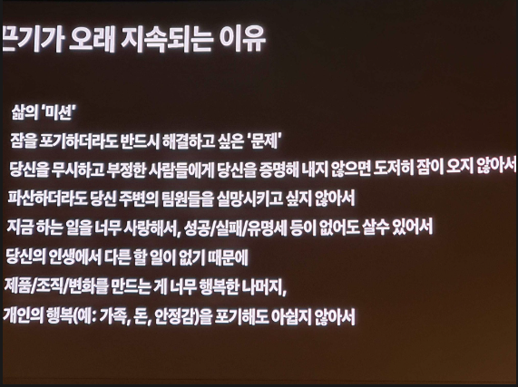 성장을 위해서는, 문제 재정의 이전에 '존재 방식'부터 정의해야 한다고 남궁훈 대표님이 말씀하셨죠! 또 토스 이승건 대표의 키노트 중, 끈기의 이유는 곧 창업가 본인이 시장에서 왜 존재해야만 하는지에 대한 것들입니다.