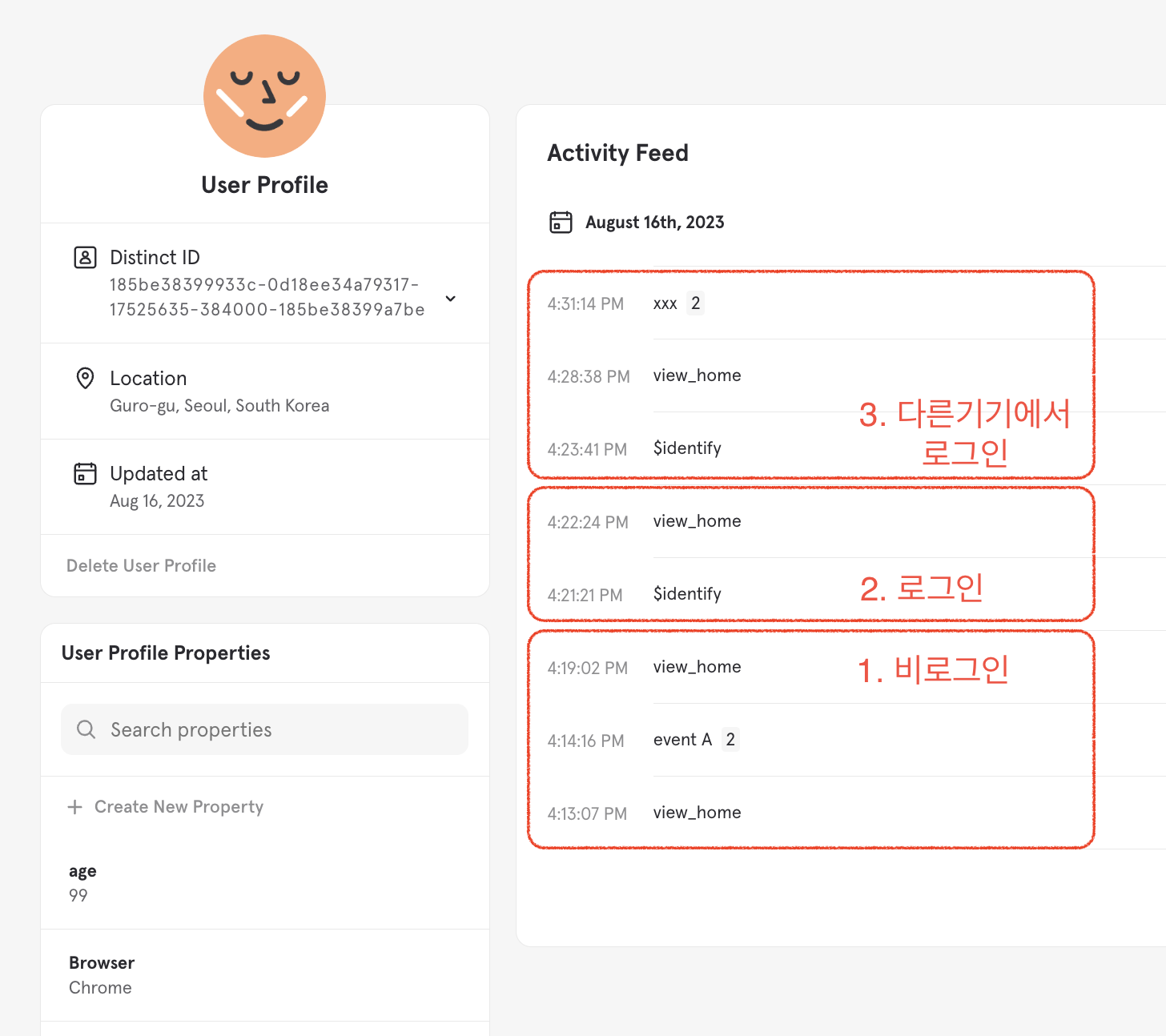 - 브라우저 A에서 로그인 후 브라우저 B에서 로그인했을 때 A에서 일으킨 이벤트와 B에서 일으킨 이벤트가 하나의 프로필에 합쳐졌는가