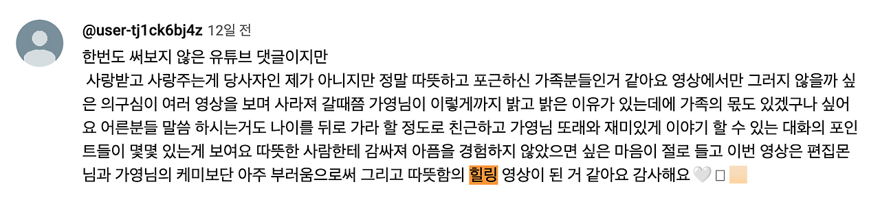 이와 비슷한 댓글은 '가요이 키우기' 채널의 '왜 화목한 가정에서 자란 사람을 만나라고 하는지' 영상에서도 보입니다. 가요이님의 포근하고 화목한 가정을 보고, 가요이님이 항상 왜 그렇게 밝은지 알게 되었고, 덕분에 힐링 되었다는 댓글들이 달립니다.