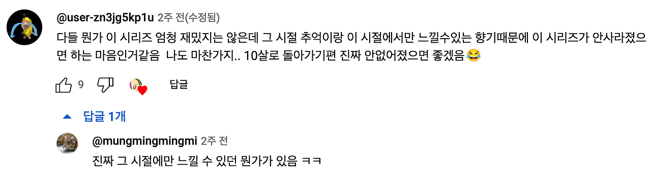 유튜브도 마찬가지입니다. 꿀팁한인 채널에선 '지금 지능 그대로 10살로 돌아 가보기' 시리즈를 합니다. 영상에선 아이들의 웃음소리가 끊임없이 들립니다. 이런 순수함 속에 시청자들은 "그 때 그 시절에만 느낄 수 있는, 추억에 서린 감정을 느끼게 한다"라고 댓글을 답니다.