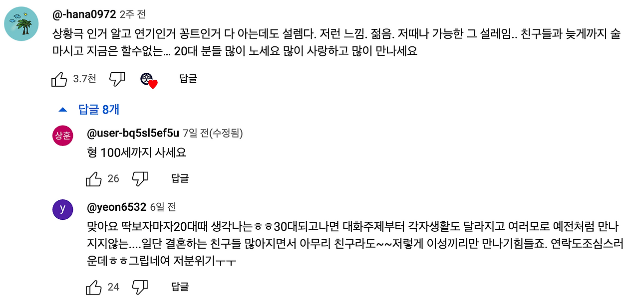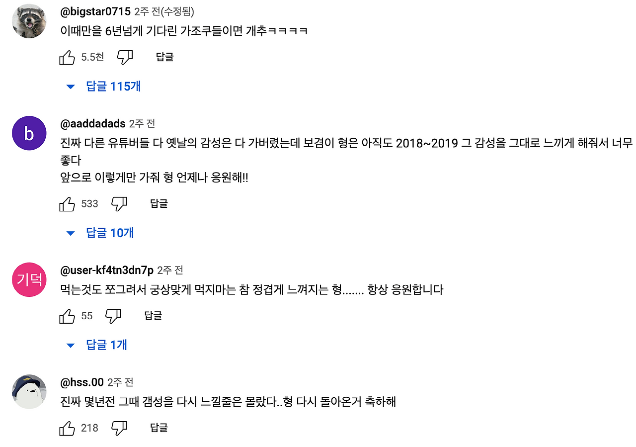 이렇게 소재 자체로 '과거의 나, 그때 그 시절의 나'를 생각나게 할 수 있지만, 크리에이터 분의 변하지 않는 모습도 마찬가지입니다. 보겸님의 '30시간 굶고 점보 라면을 먹는' 영상에선, "형! 영상 감성이 유튜브 초창기인 2018년~2019년을 생각나게 해줘. 고마워"라는 댓글들이 많습니다.