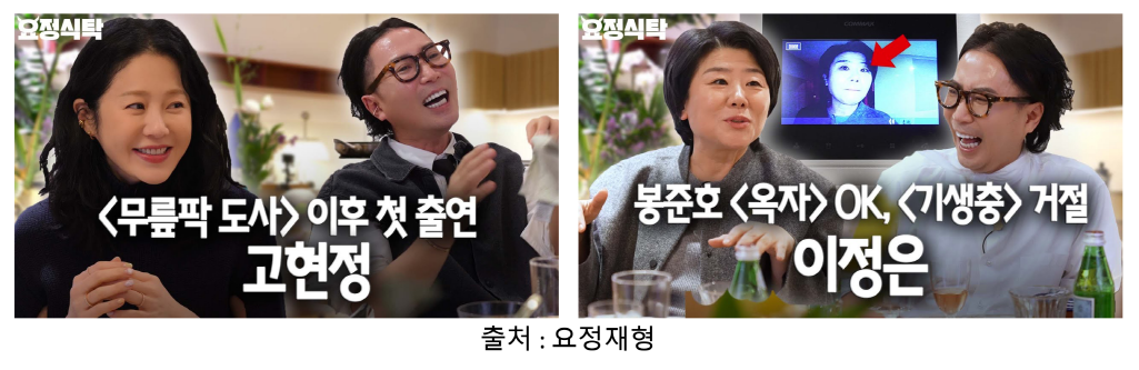 두 번째 유형에 해당하는 토크쇼가 요정재형님이구요. 정재형님이 나긋나긋한 분위기로 게스트가 살아온 삶과 삶의 자세들을 이끌어내고, 중간중간 소소한 웃음 포인트도 놓치지 않습니다. 그리고 게스트 분들도, 유튜브에 잘 등장하시지 않는 분들을 섭외하시죠. 배우 이정은님, 고현정님이죠. 고현정님 영상은 현재 489만view입니다.
