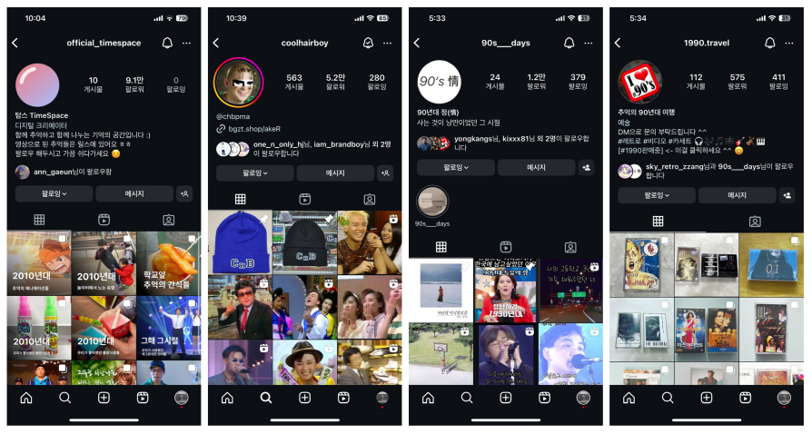 과거로 돌아간다는 느낌을 주는 것도 좋습니다. 요즘 인스타엔 '2000년대 이전의 영상들, 즉 8090 시대의 영상이나 이미지를 올리는 분들이 있고, 이런 계정들의 팔로워 수가 조금씩 늘어나고 있습니다. 어느 계정은 아이들이 놀이터에서 노는 모습과, 90년대의 길거리를 보여주며 명상 소리에 맞춰 "아무 걱정도 없었던 그때로 돌아가고 싶다"고 이야기를 하시는 분들도 있죠.
