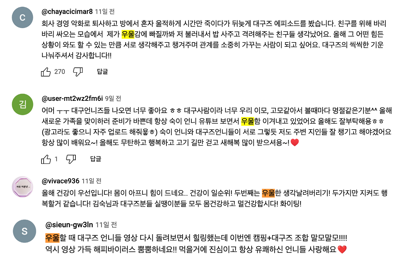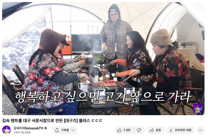 김숙님의 채널에선, 친구분들이 놀러 왔습니다. '대구즈'인데, 와서 맛있는 것도 많이 먹고, 찐친들의 케미를 제대로 보여주죠. 이 영상의 댓글엔 '우울할 때 대구즈 언니들 영상 보면서 힐링했다'다는 이야기들이 보입니다. 김숙님과 김숙님의 친구분들을 보고, 해피 바이러스가 느껴진다는 분들도 있고, 힘들 때 나를 도와주던 친구가 생각났다고 하는 분도 있고, 명절에 보는 고모와 이모 같다고도 하죠.