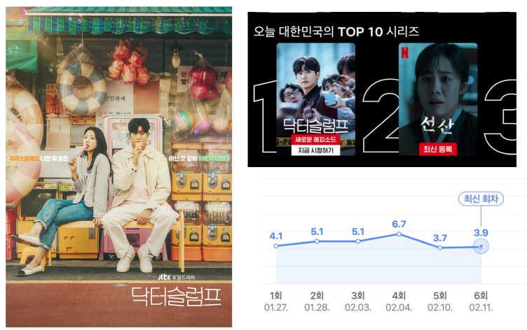 드라마에선 우울증과 슬럼프를 극복하는 모습을 잘 그려낸다면, <웰컴투 삼달리>만큼 잘 될 확률이 높습니다. 웰컴투 삼달리도, 비슷한 내용이었기 때문이죠. 갑작스럽게 모든 것을 잃고 나락으로 떨어지고 난뒤, 고향으로 돌아와 가족과 친구들의 품에서 숨고르기를 한 내용입니다. 최종화 시청률은 12.4%로 마무리됐습니다.