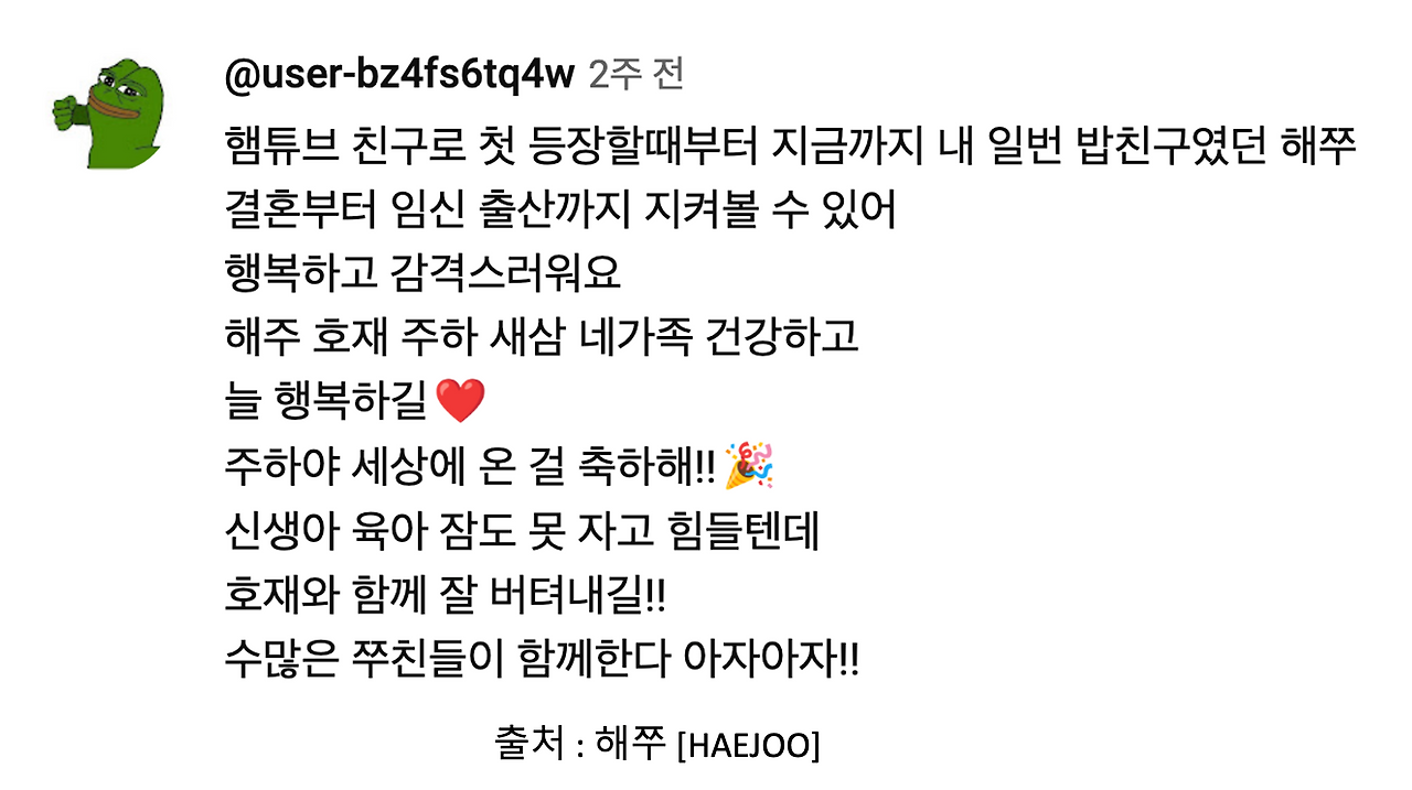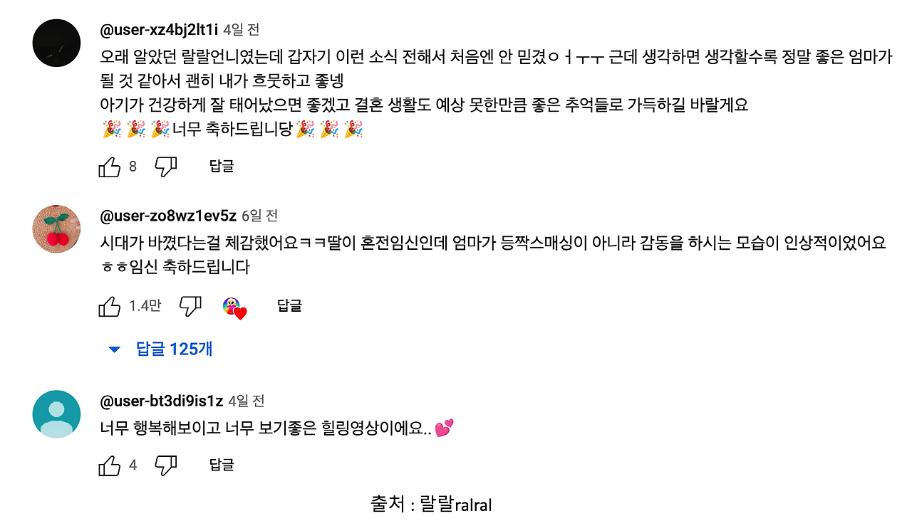 팬분들은 아기들이 태어나기 전부터 쭉 봐왔던 분들입니다. 시간이 흘렀지만, 크리에이터 분의 결혼부터 임신 출산까지 지켜볼 수 있어서, 행복하다고 이야기하죠. 해쭈님의 출산 전 3일 기록에 달린 댓글입니다. 그리고 랄랄님도 임밍아웃을 하셨죠. 랄랄님의 어머님과 지인분들이 축하해 주는 모습에, 팬분들도 "주변 지인분들 반응이 감동이에요. 언니 행복하고 축하해요"라고 댓글을 답니다.