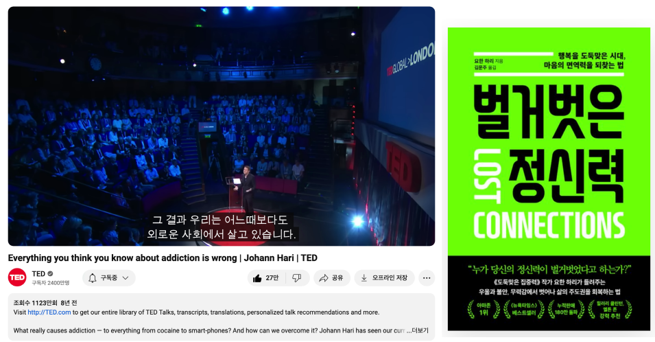 <도둑맞은 집중력>의 저자 2015년 TED에서 '그동안 당신이 알고 있던 중독에 대한 것은 잘못되었습니다'를 이야기한 영상이 있습니다. 쇼핑 중독, SNS 중독, 게임 중독, 음식 중독 등, 중독엔 다양한 종류의 중독이 있는데 '마약 중독'을 예시로 듭니다. 마약은 (기존에 알려진 대로) 화학적 반응으로 중독이 되는 것이 아니라, '고립'이나 '사회적 단절' 때문에 중독에 의지하는 것이라고요.