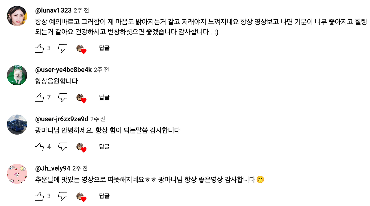 팬분들은 광마니님 영상엔 '점점 여유가 사라지는 세상'이라는 자막이 나오기도 하죠. 아마 이러한 부분 때문에 광마니님은 더더욱 팬분들을 위한 영상을 찍는 게 아닐까 싶습니다. 팬분들은 광마니님 영상을 '먹방 힐링 라인'이라 부르며, 쯔양님 영상과 함께, 영상을 보고 나면 항상 기분이 좋아지고, 마음이 따뜻해진다며, 힘이 되는 말씀도 감사하다고 이야기 합니다.
