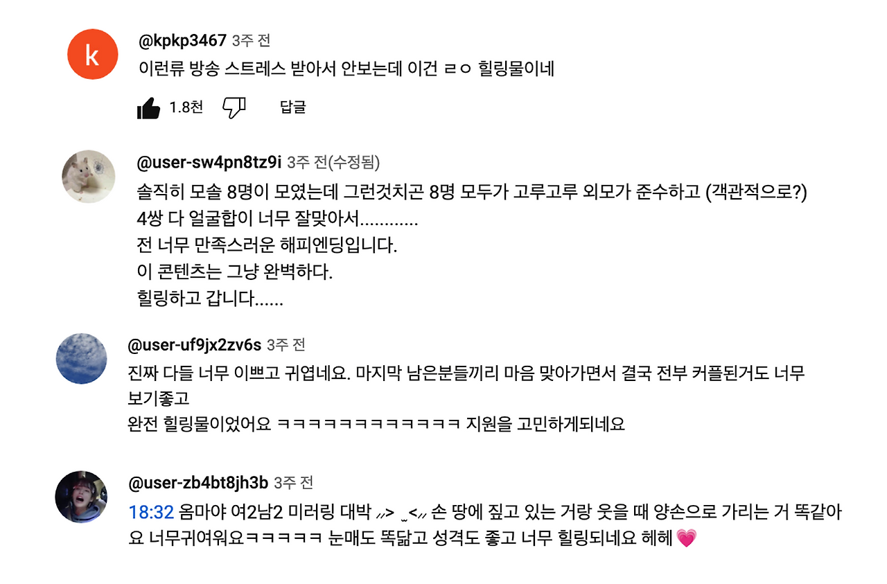 1월 초 뉴스레터에서 2024 유튜브 트렌드는 '힐링'으로 말씀드렸습니다. 시청자들이 '힐링'을 느끼고 있다는 것은, 여러 가지 콘텐츠 유형에서 발견됩니다. 첫 번째는 '좁은 공간에 8명의 모쏠 남녀를 가두어 놓고, 커플이 되면 나가는', film94의 'Tiny Room'입니다. 콘텐츠의 포맷만 보면, 자극적일 것 같지만, 참여자들 모두가 서로를 존중하며, 순수하고 풋풋하게 서로를 대하죠.
