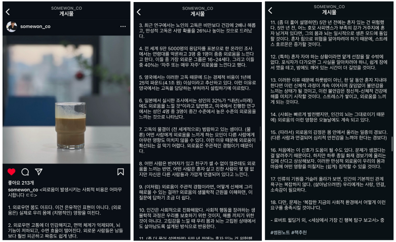 이는 현대에서도 마찬가지이며, 결국에는 '외로움 자체가 야기하는 사회적 비용이 어마 무시하다고 하죠. 노인의 만성적 고독은 사망 확률을 26%나 높이며, 전 세계 표본 조사를 통한 결과 3명 중 1명이 외로움을 느끼고 16-24세가 가장 많이 느낀다고 합니다.