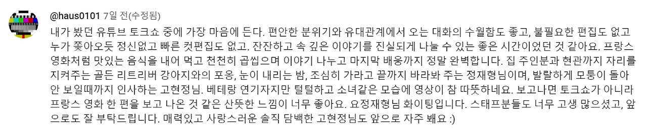 마지막 세 번째는 요정재형님입니다. 현재 웹예능 트렌드는 토크쇼입니다. 게스트를 초대하고, 게스트의 이야기를 듣죠. 다만 수많은 토크쇼 중에서, 강세를 보이는 토크쇼들은 게스트의 팬덤이 세거나, 혹은 게스트의 인생관을 담아내며, 편안한 분위기를 주는 토크쇼입니다.