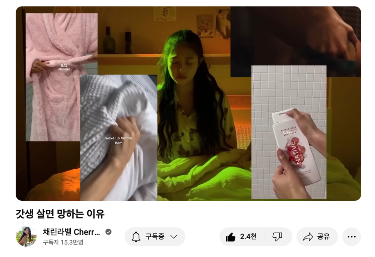 지난번 뉴스레터에선 '한국이 세계에서 가장 우울한 나라'가 된 이유는 빠른 경제 성장 속, 과도한 경쟁이라고 말씀드렸습니다. 이러한 부분이 가시적으로 가장 잘 드러나는 카테고리는 브이로그입니다. 브이로그의 키워드는 '갓생', '미라클 모닝', 심지어 'Productive vlog'까지 있죠. 한국인들은 '생산성'에 대한 강박이 있으며, 이는 <트렌드 코리아 2024>의 '분초사회(시간을 초단위로 쪼개 쓰는)' 빡빡한 삶으로 이어집니다.