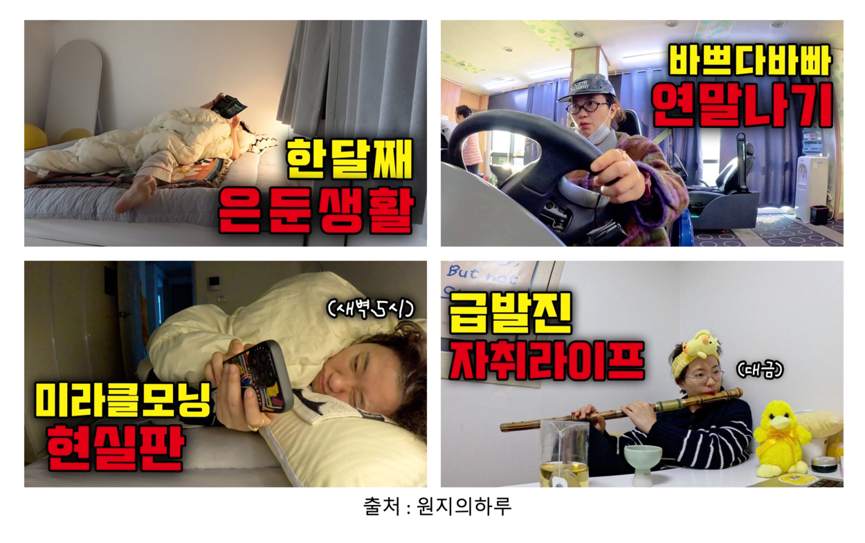 원지의하루님의 한국에서의 일상은 꼭 챙겨 보시길 추천드립니다. 한달 째 은둔생활 -> 바쁘다 바빠 연말 나기 -> 미라클 모닝 현실판 -> 급발진 자취라이프 모두 인급동에 갔죠. 시간을 쪼개 하루하루 열심히 사시며, 가끔씩은 쇼츠에 중독되는 원지님의 일상이, 현시대의 우리들을 가장 잘 표현한 콘텐츠라 생각합니다. 댓글을 봐도, 많은 팬분들이 공감하고 있다는 것을 알 수 있고요.