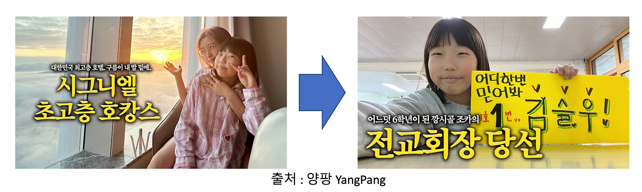 양팡님이 조카와 같이 보내는 일상 역시 마찬가지로, 모두 인급동에 갔죠. 초등학생이고 깡시골에 살죠. 그만큼 순수하고 소박합니다. 조카 집에 깜작 방문하는 영상이나, 조카와 함께 시그니엘 초고층에 묵는 모습, 그리고 전교회장 당선되어, 축하를 해주러 가는 모습들 모두, '힐링물'입니다. 깡시골에서만 느낄 수 있는, 고즈넉함도 함께 담겼으니까요.