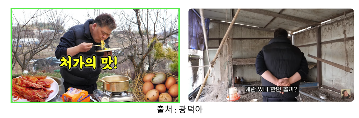 이 고즈넉함은 천하장사 박광덕님의 영상에서도 드러납니다. 시골에서 특별한 재료 없이, 한적하게 라면을 먹방하시는 모습이 인급동에 갔죠. 댓글을 보면, 시청자분들이 '먹방 영상'이 아닌, '힐링 영상'으로 인식하고 있는 것을 알 수 있습니다.