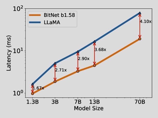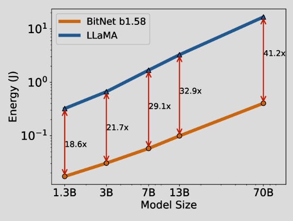 가장 놀라운 점은 에너지 소모입니다. B1.58은 LLaMA에 비해 수십 배 적은 에너지를 소모합니다. 이는 B1.58은 가중치를 정수로만 저장하는데, 정수의 연산이 실수의 연산보다 에너지 소모가 훨씬 적기 때문에 이런 놀라운 결과가 나올 수 있었습니다.