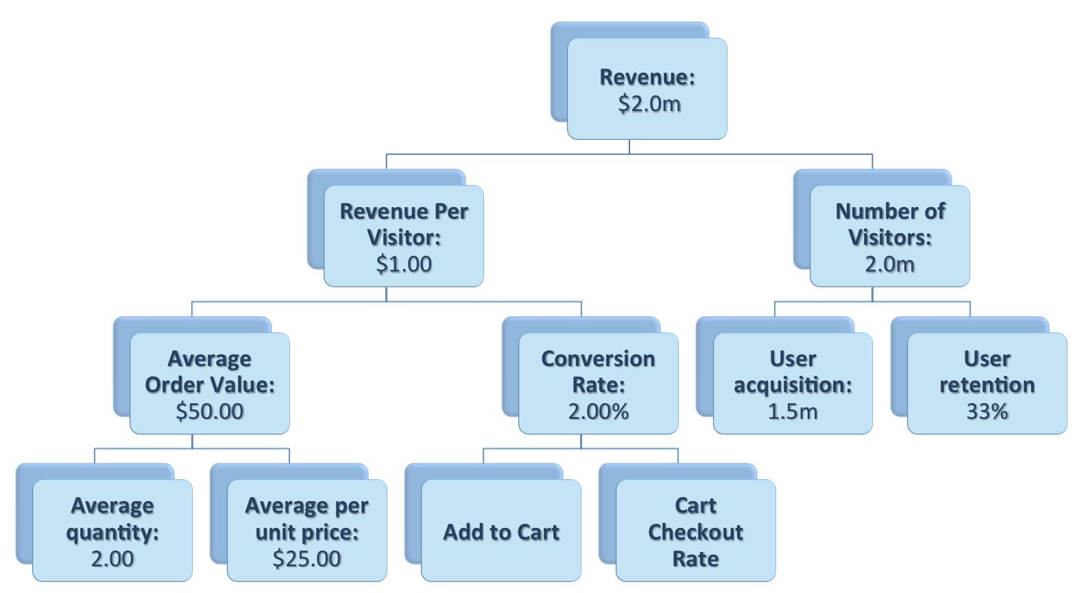 예를 들어 방문자 한명당 Revenue를 올리거나 방문자수를 올리면 전체 Revenue가 올라갑니다. 방문자 한명당 Revenue는 다시 평균 주문 금액(AOV)을 올리거나 주문 전환율(CVR)을 올리면 올라갑니다.