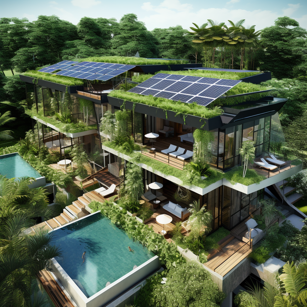 녹색 건축을 강조하는 지속 가능한 호텔 디자인으로, 태양 전지판, 수직 정원 및 빗물 수집 시스템이 미학에 매끄럽게 통합되어 있습니다.