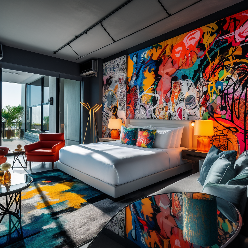 몰입형 설치예술의 역할도 하는 부티크 호텔 스위트룸은 맞춤형 가구와 큐레이팅된 예술 작품으로 손님들에게 편안함과 창의성의 독특한 조화를 제공합니다.
