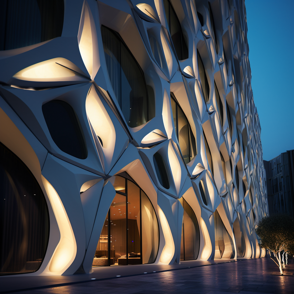 역동적이고 형태가 변화하는 외관을 갖춘 호텔 외관으로, 최첨단 소재와 조명을 활용하여 상징적인 랜드마크건축을 만듭니다.